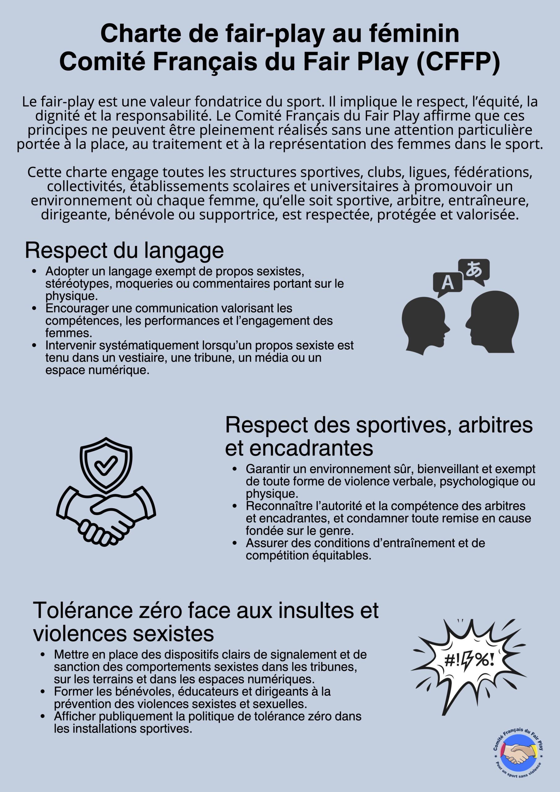 Le fair-play est une valeur fondatrice du sport. Il implique le respect, l’équité, la dignité et la responsabilité. Le Comité Français du Fair Play affirme que ces principes ne peuvent être pleinement réalisés sans une attention particulière portée à la place, au traitement et à la représentation des femmes dans le sport.