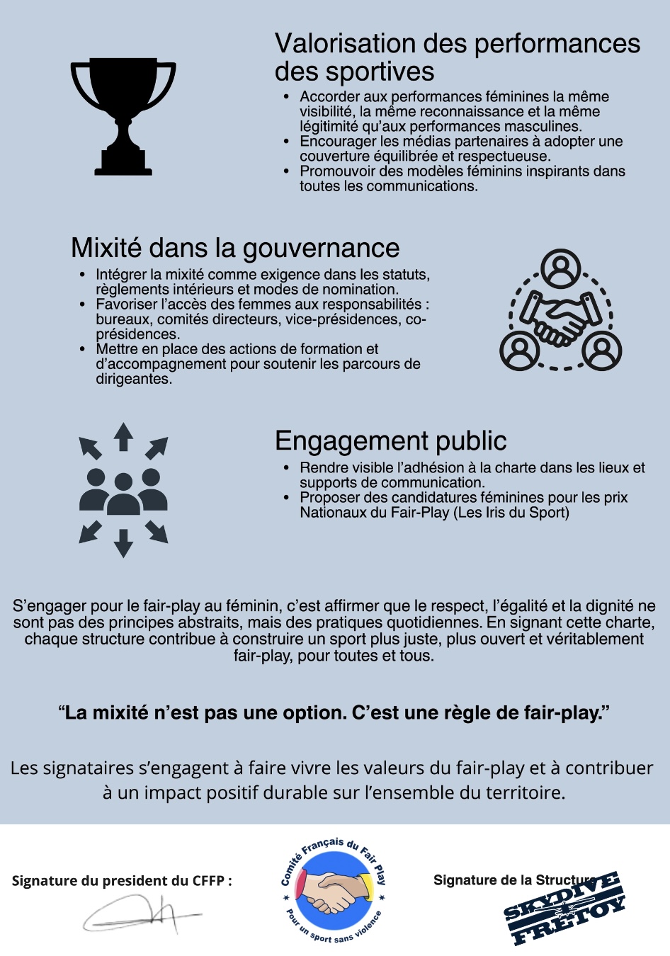 Skydive Fretoy adhère à la Charte du Fair-Play au féminin, avec le soutien de la Fédération Française de Parachutisme.